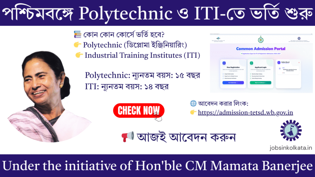 Under the initiative of Hon’ble Chief Minister Mamata Banerjee, online applications are invited for admission to Polytechnic Diploma and Industrial Training Institutes (ITI) for the academic year 2026–2027.