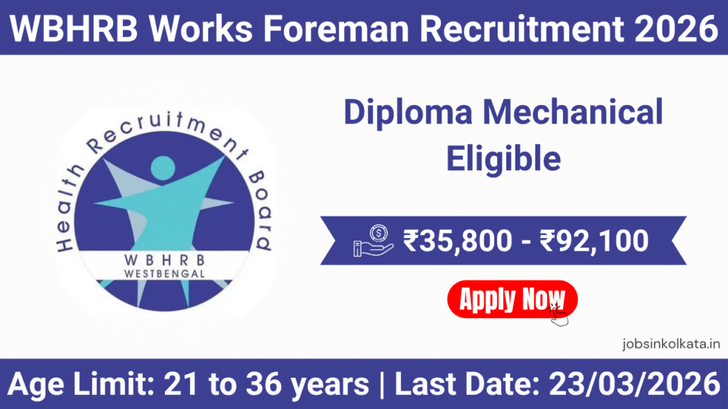 West Bengal Health Recruitment Board (WBHRB) Recruitment 2026 for 1 post of Works Foreman. Candidates Can Apply Online. The online application opens on 02-03-2026, and closes on 23-03-2026. The candidate shall apply online through WBHRB official website.