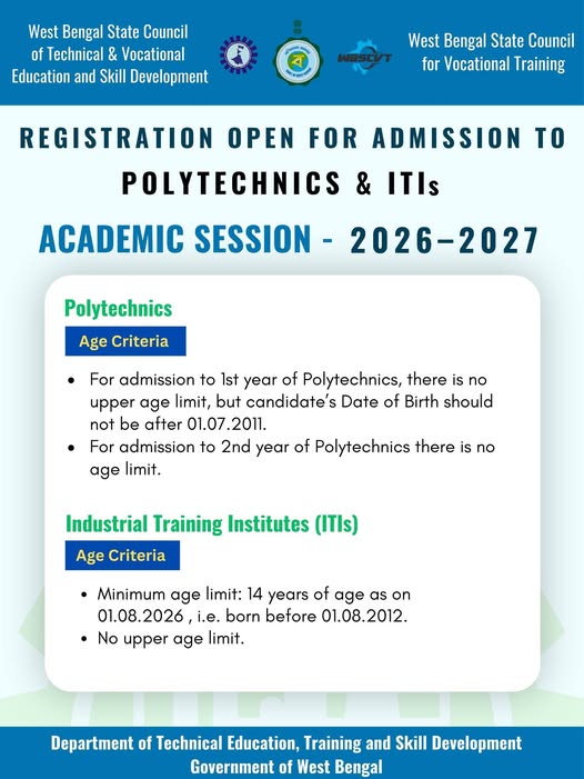 - অথবা: মাধ্যমিকের পর ২ বছরের ITI কোর্স সম্পন্ন করা প্রার্থীরাও সরাসরি দ্বিতীয় বর্ষে ভর্তির সুযোগ পাবেন।